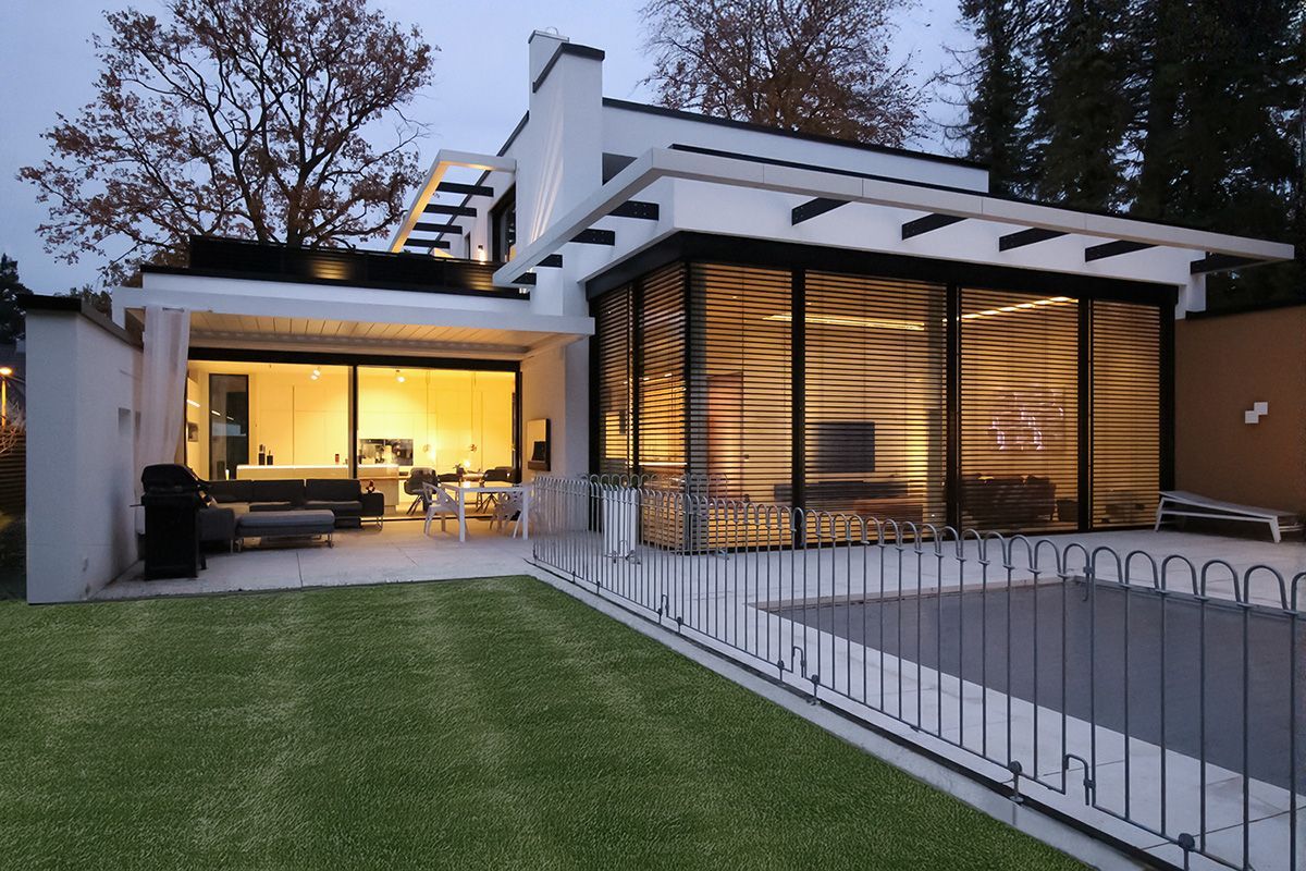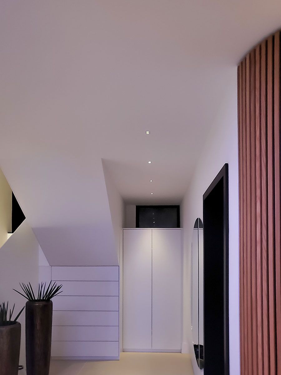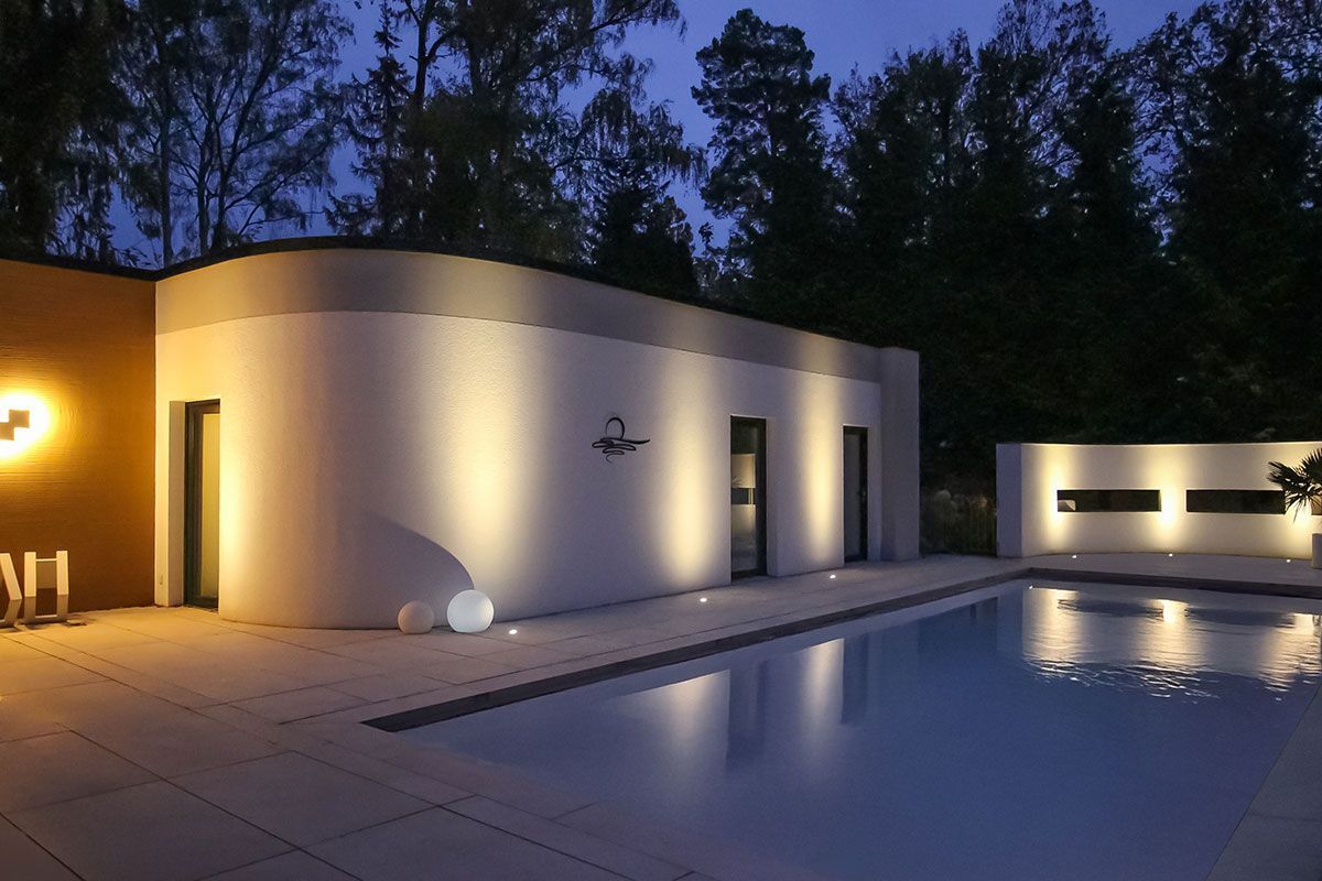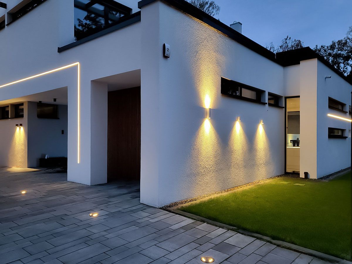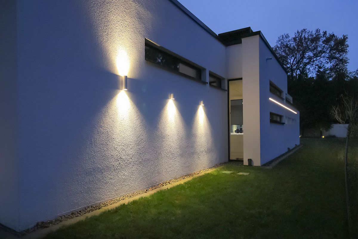 Privathaus ListButtonEine Kombination aus direkter & indirekter Wandbeleuchtung und einem LED-Band im Dachüberstand.