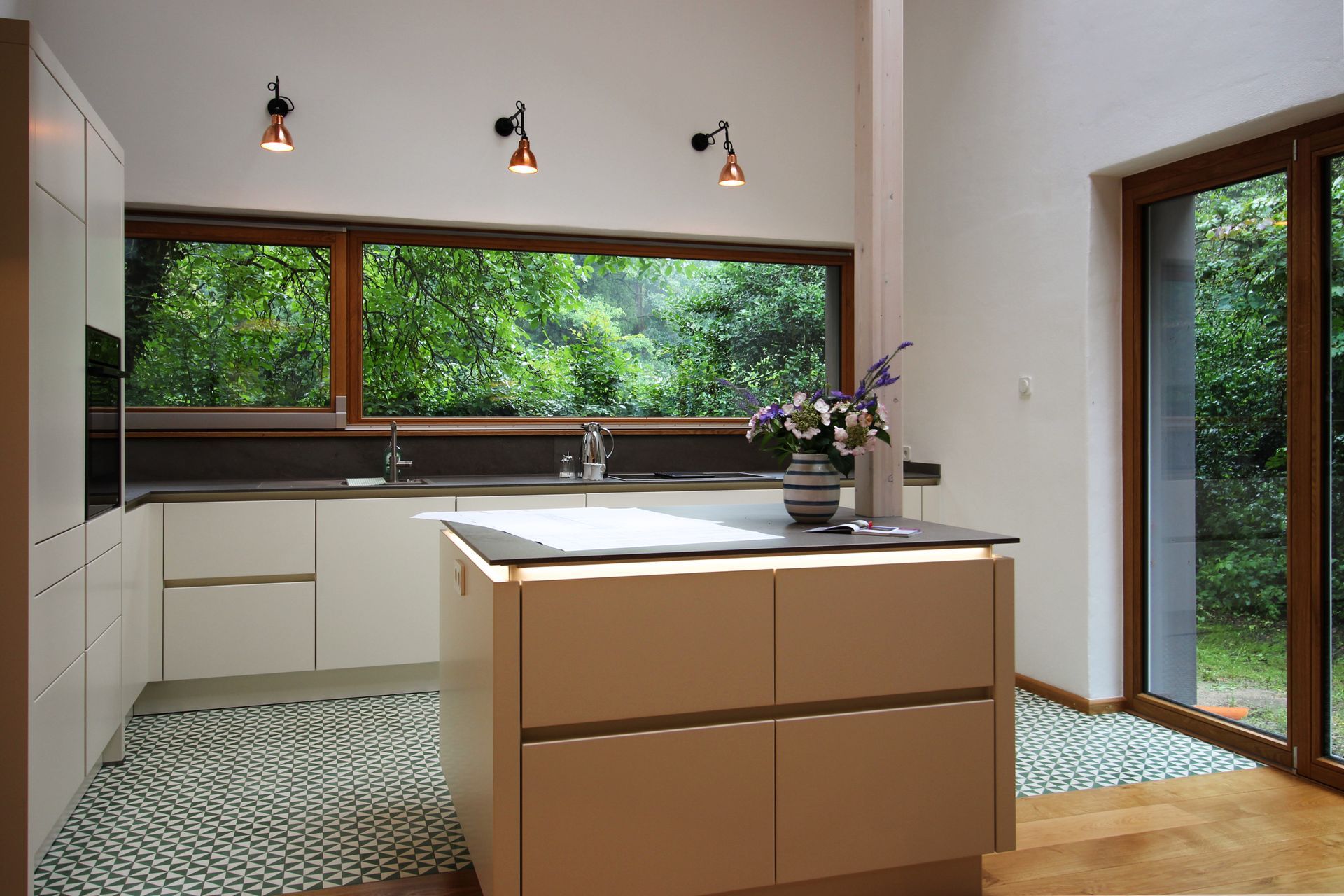 HäuslingshausButtonDie Arbeitsplatz der offenen Küche wird durch 3 Leuchten von Lampe Gras beleuchtet.