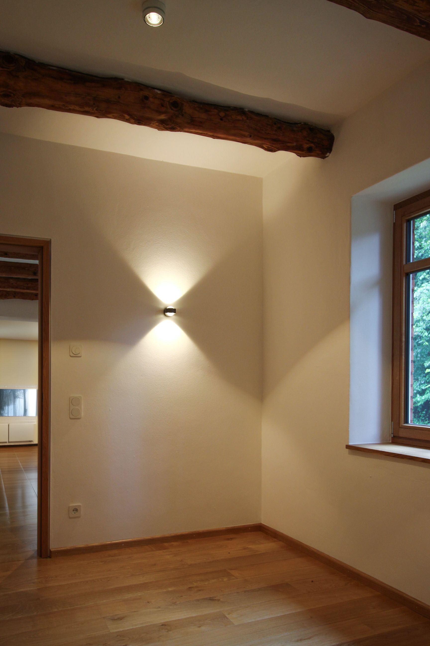 HäuslingshausButtonEine indirekte Beleuchtung erhellt den Dachstuhl mit Lehmputz und die alten Dachbalken. Das stimmungsvolle Licht wurd durch die Bett-Leseleuchte unterstützt.