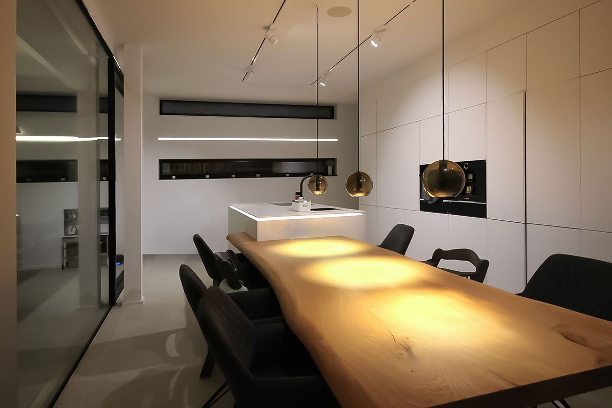 Die lichtdurchflutete Architektur der Villa verlangt nach einer Beleuchtung, die den Raum und seine Struktur in Szene setzt, ohne sich in den Vordergrund zu drängen. So wurden vor allem verschiedene Einbauleuchten ausgewählt, die sich dezent in die Architektur integrieren und dabei Wände und besondere Bereiche gezielt in Szene setzen. Wandleuchten und LED-Vouten akzentuieren die Architektur subtil und schaffen stimmungsvolle Licht- und Schatteneffekte. Für Ess- und Wohnbereich kamen bewusst zurückhaltende Pendelleuchten zum Einsatz, die dem Raum zusätzliche Atmosphäre verleihen, ohne von der beeindruckenden Architektur abzulenken.